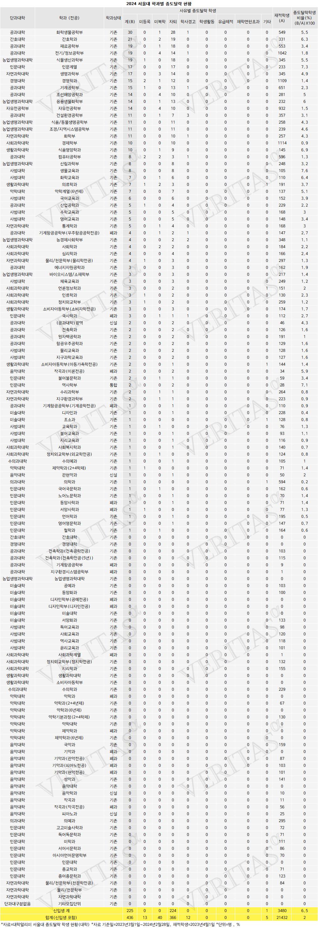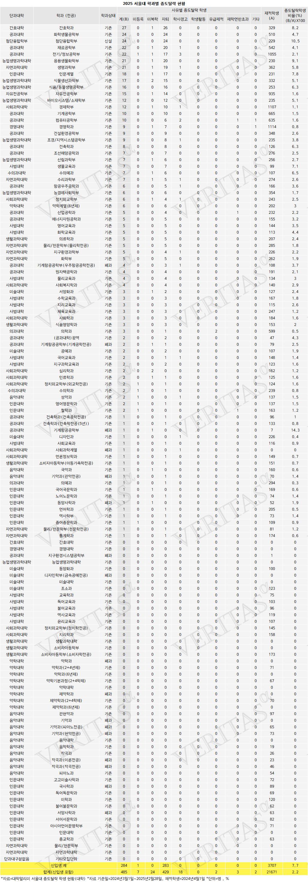 Áö³ÇØ ±³À°ºÎ¿Í ´ë±³ÇùÀÌ 8¿ù Á¤º¸ °ø½Ã¸¦ ÅëÇØ °ø°³ÇÑ ´ëÇо˸®¹Ì ÀÚ·á ¡®ÁßµµÅ»¶ô Çлý ÇöȲ¡¯¿¡ ÀÇÇϸé 2024³â 3¿ù1ÀϺÎÅÍ 2025³â 2¿ù28ÀϱîÁö ¼¿ï´ë ÁßµµÅ»¶ô ÇлýÀº 485¸íÀ¸·Î ÆÄ¾ÇµÆ´Ù. ÀÌ °¡¿îµ¥ 88%¿¡ ÇØ´çÇÏ´Â 429¸íÀÌ ¡®ÀÚÅ𡯸¦ ÅÃÇß´Ù. ÃÖ°íÇкÎÀÎ ¼¿ï´ë ÀÌÅ»ÀÇ °æ¿ì ´ëºÎºÐ ÀǴ븦 ÇâÇÑ °ÍÀ¸·Î ºÐ¼®µÇ¸é¼ ¼¿ï´ëÁ¶Â÷ ÀǴ븦 ³ë¸° ¹«ÇÑ N¼ö Çà·ÄÀ» ÇÇÇÏÁö ¸øÇß´Ù´Â ºÐ¼®ÀÌ ³ª¿Â´Ù.